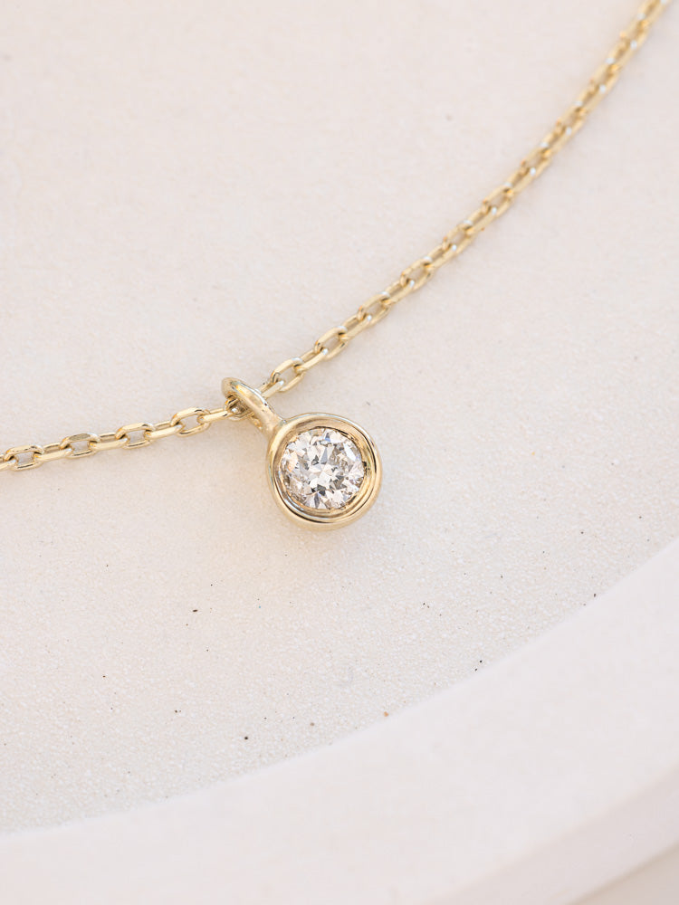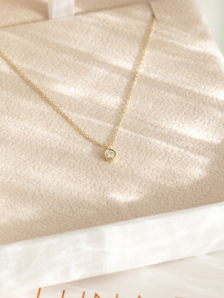 The Diamond Sky Necklace has a gold weight of 0.88 grams, with the pendant measuring 3mm in diameter. The chain is 40cm with a 5cm extension, providing a balance of delicacy and substance.