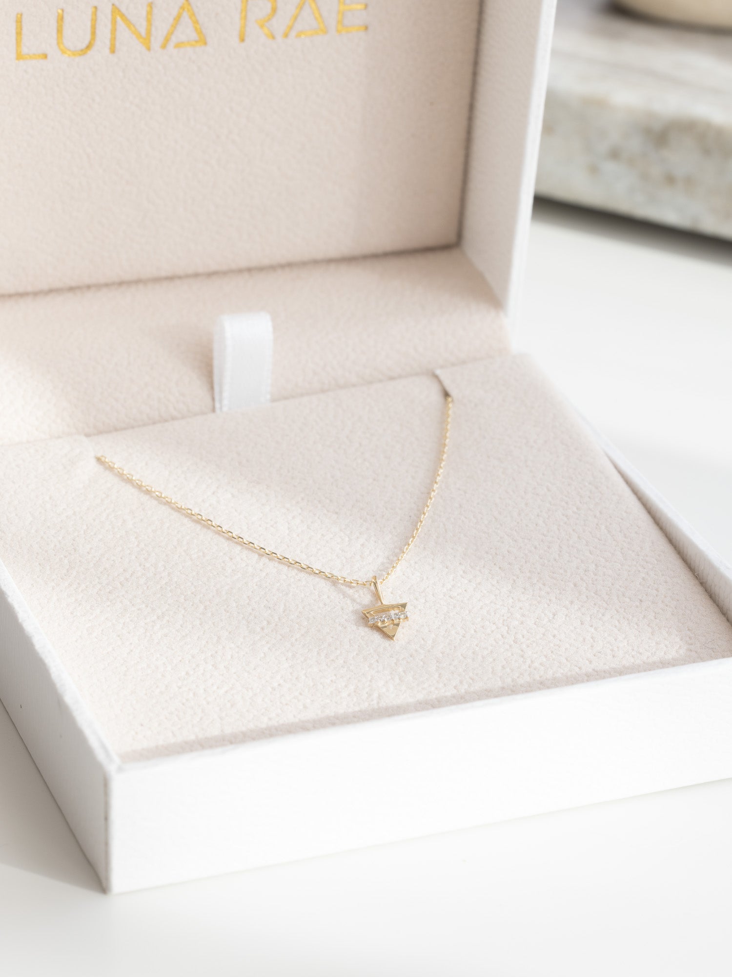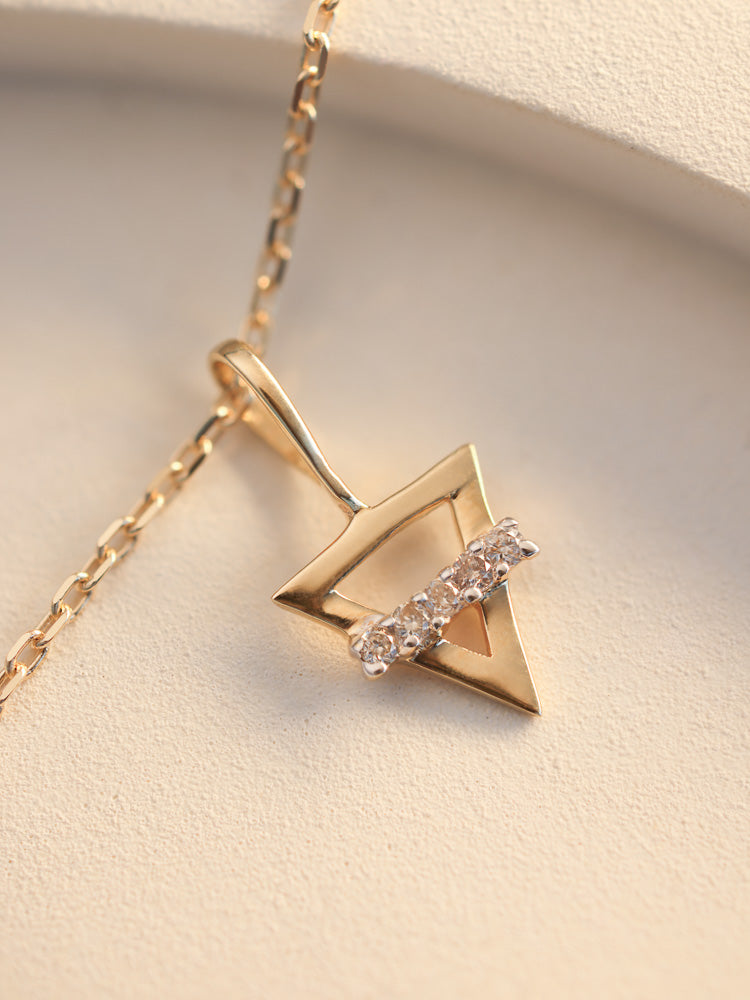 This necklace features an Earth triangle pendant in solid 9K gold that points downwards towards the ground, and is accented with a line of delicate white diamonds symbolising the essence of Earth. Crafted from solid gold, this necklace serves as a personal and meaningful representation of your element.