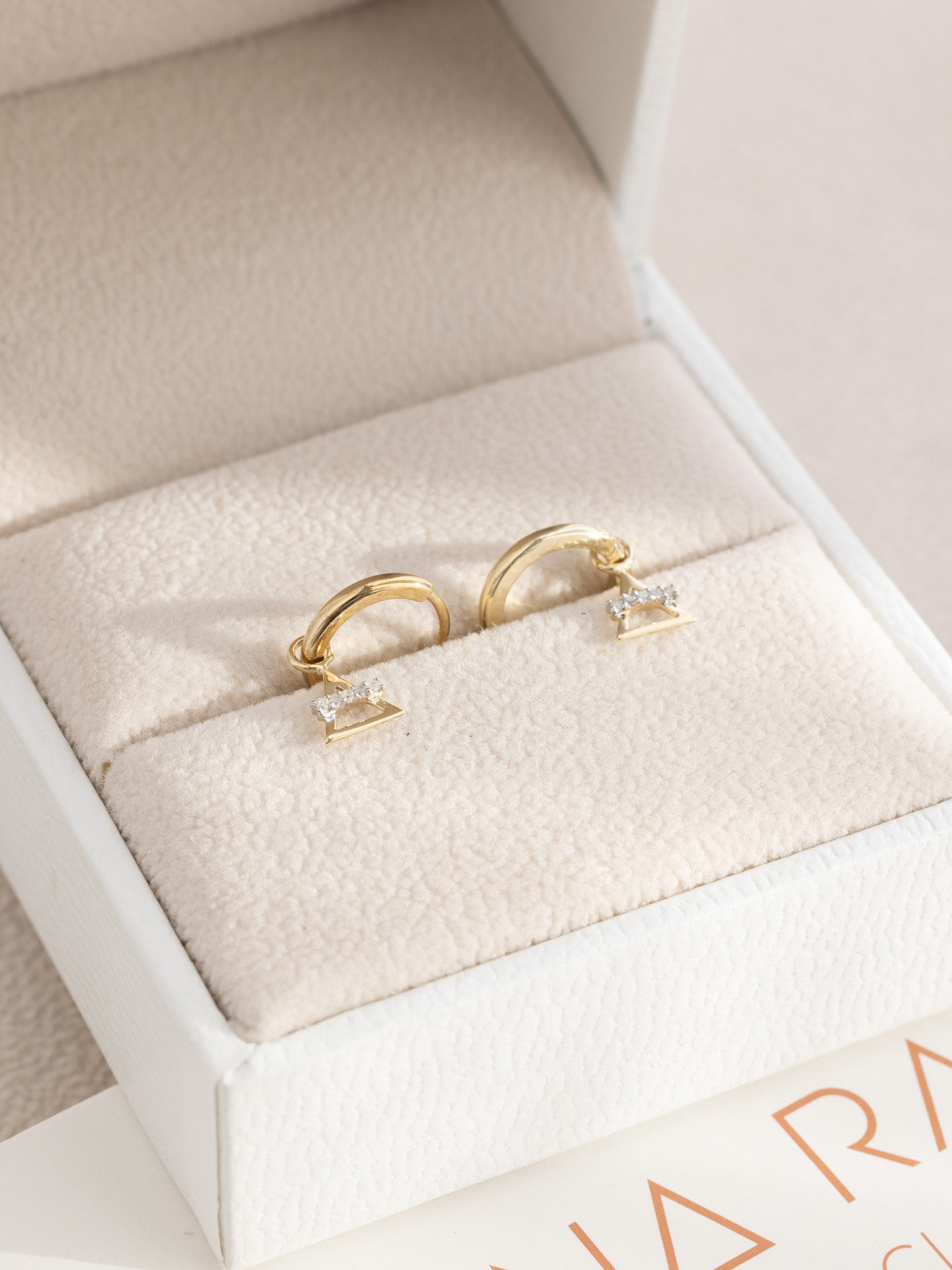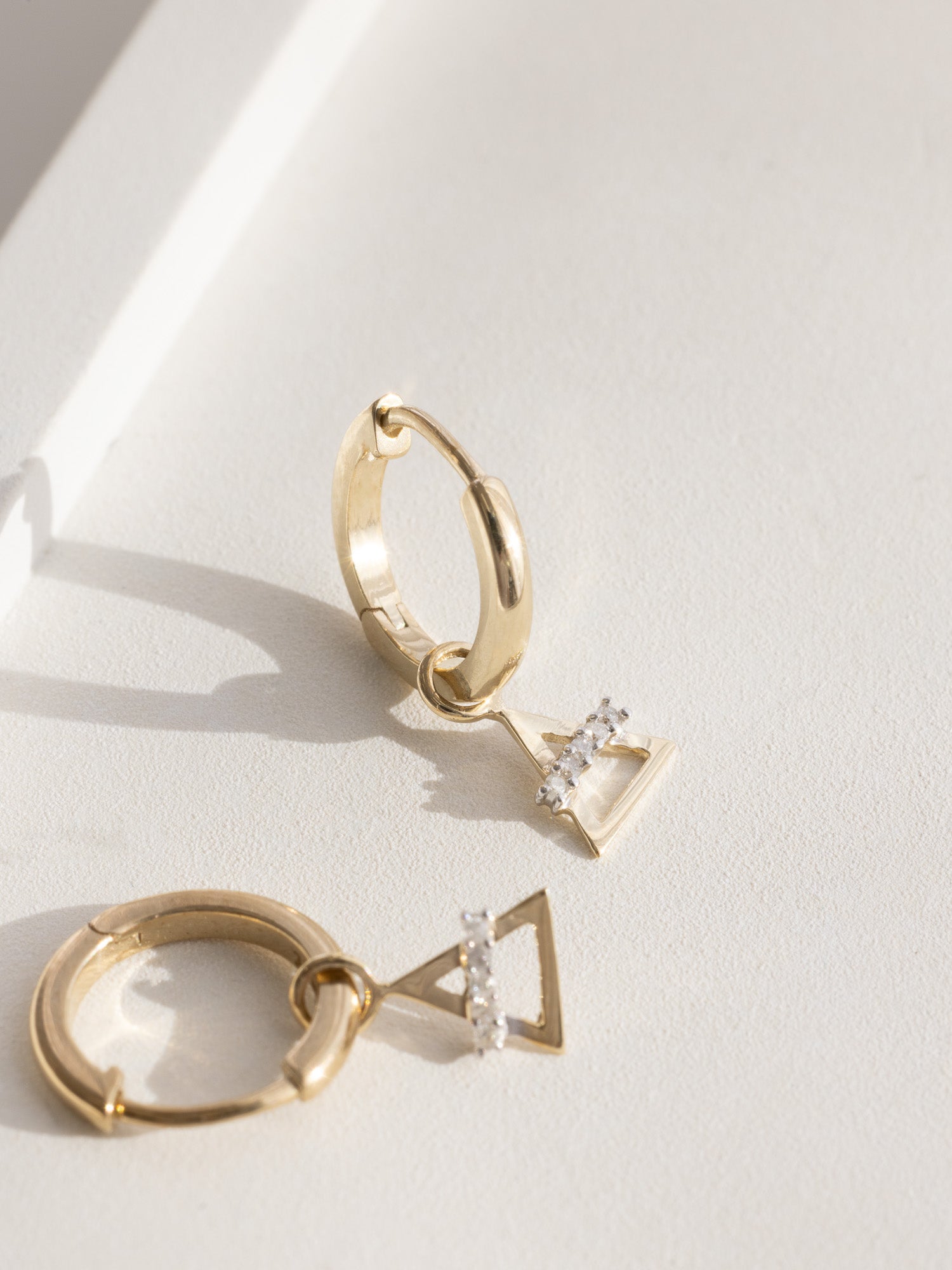 The hoops are embellished with an Air triangle charm in solid 9K gold pointing upwards, adorned with a line of delicate white diamonds embodying the spirit of Air. Crafted from solid gold, these earrings are personal, significant, and versatile as they can be worn as plain hoops without the charms.