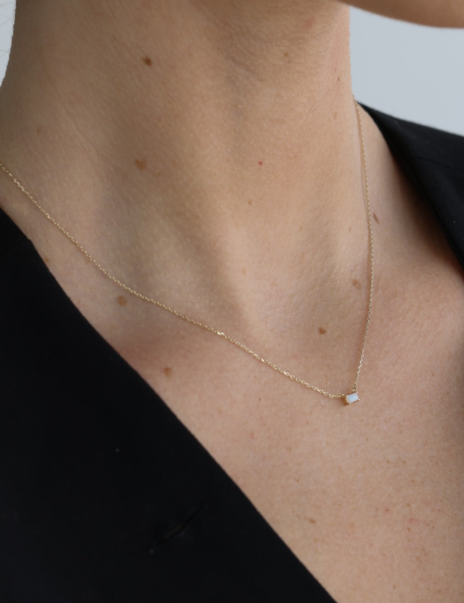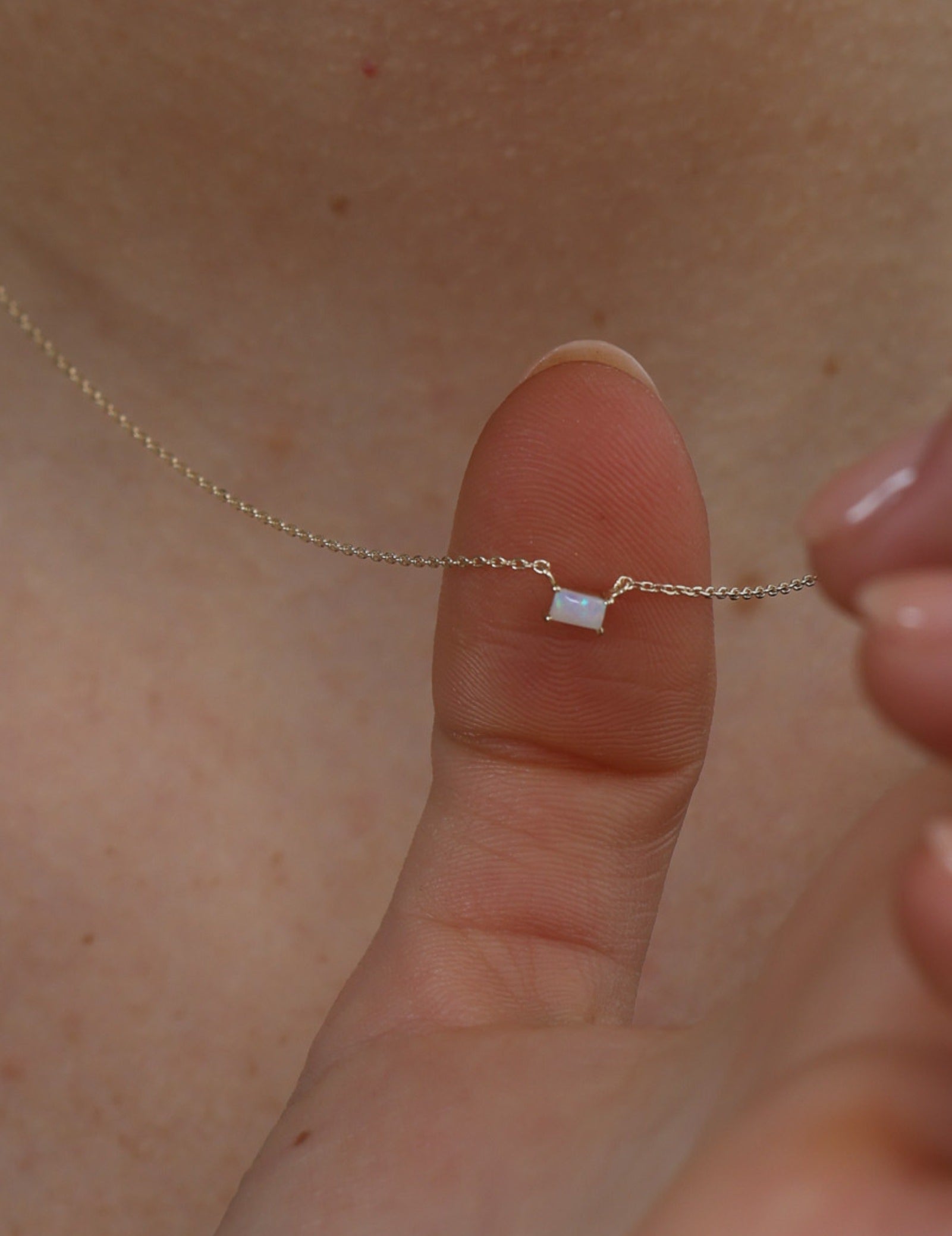 The Estella Necklace comes with a 40 cm chain and two 2.5 cm extensions, giving you the freedom to adjust its length as needed. It has a total gold weight of 1.040 grams adorned with 4mm wide x 2mm Australian Opal and total carat weight of 0.080.