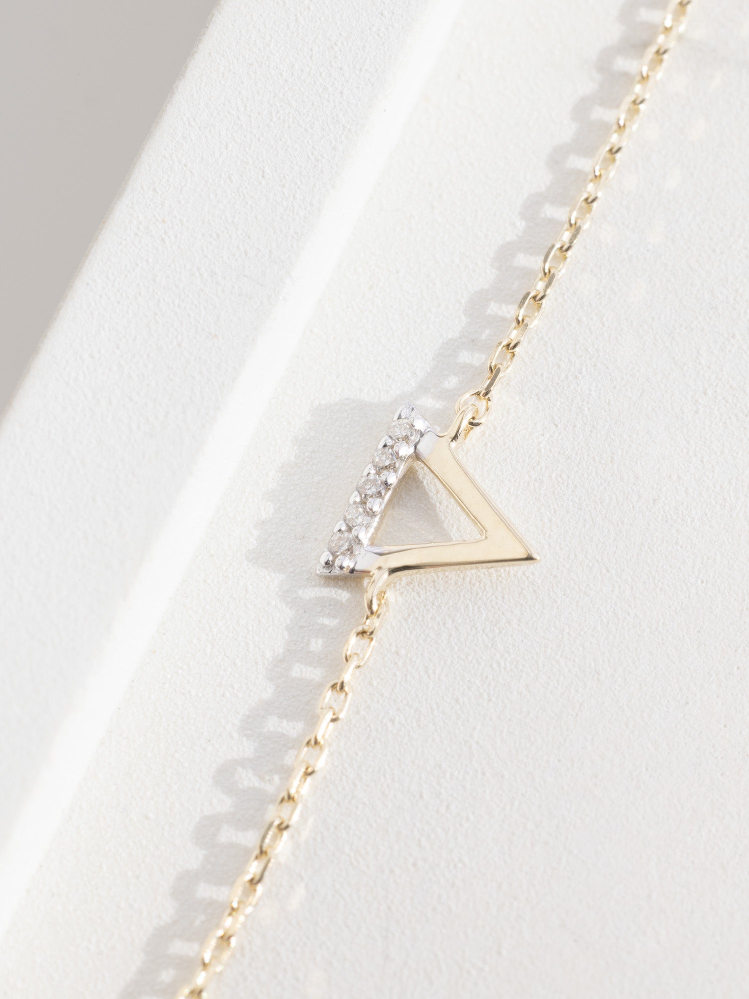 The bracelet features a Fire triangle charm in solid 9K gold that points upwards like a flame, adorned with a line of delicate white diamonds that embody the essence of Fire.