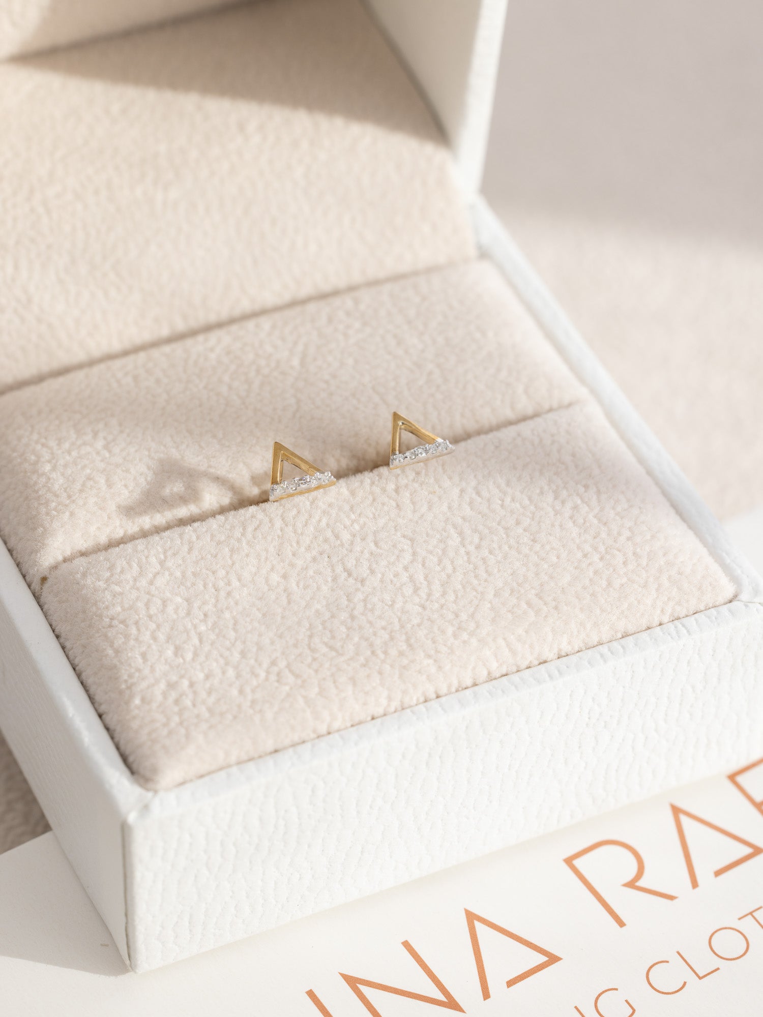 The studs feature a Fire triangle design in solid 9K gold that points upwards like a flame, adorned with a line of delicate white diamonds that embody the essence of Fire.