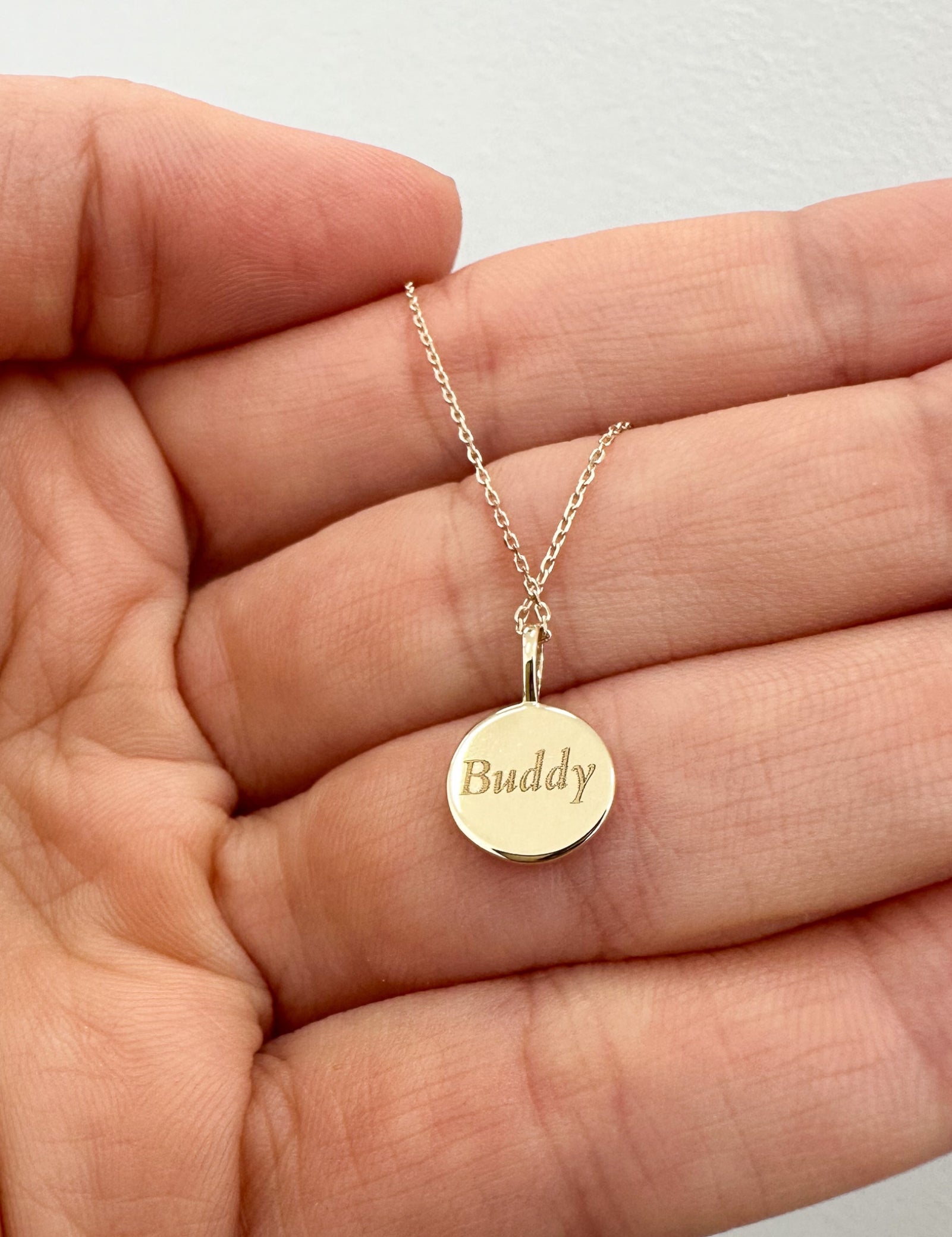 Hold onto what matters most with the Flat Disc Pendant. Crafted from solid 9K gold with a sleek, high-polish finish, this timeless piece comes in three sizes, ready to be engraved with a fingerprint, paw print, artwork, or a treasured memory—creating a keepsake that’s uniquely yours.