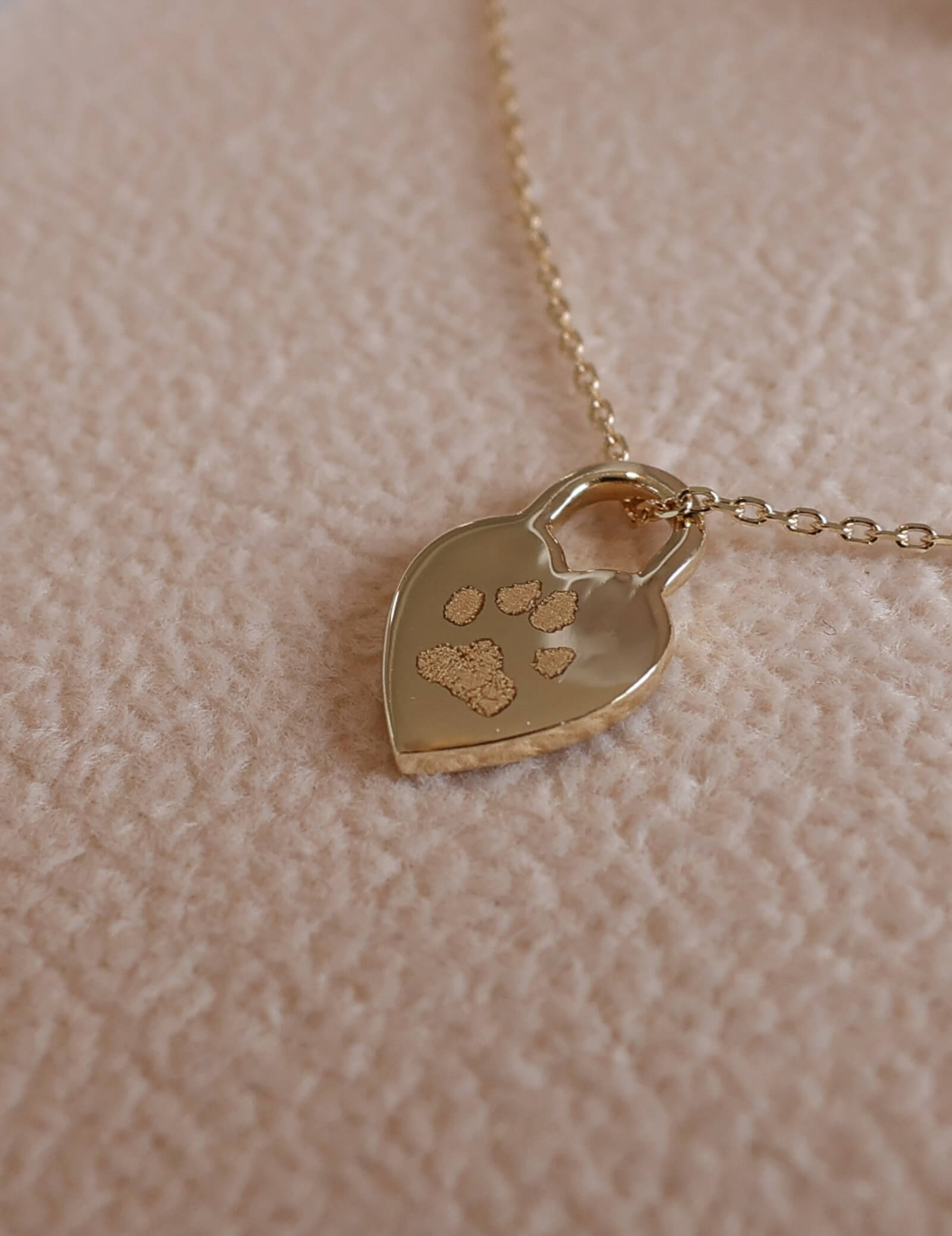 They say love leaves a mark, now you can keep it close, always. The Heart Pendant, crafted in solid 9K gold features a rounded top resembling a classic padlock and tapers into a pointed heart shape at the bottom. This is designed to hold the fingerprint, paw print, or art work of someone you love.