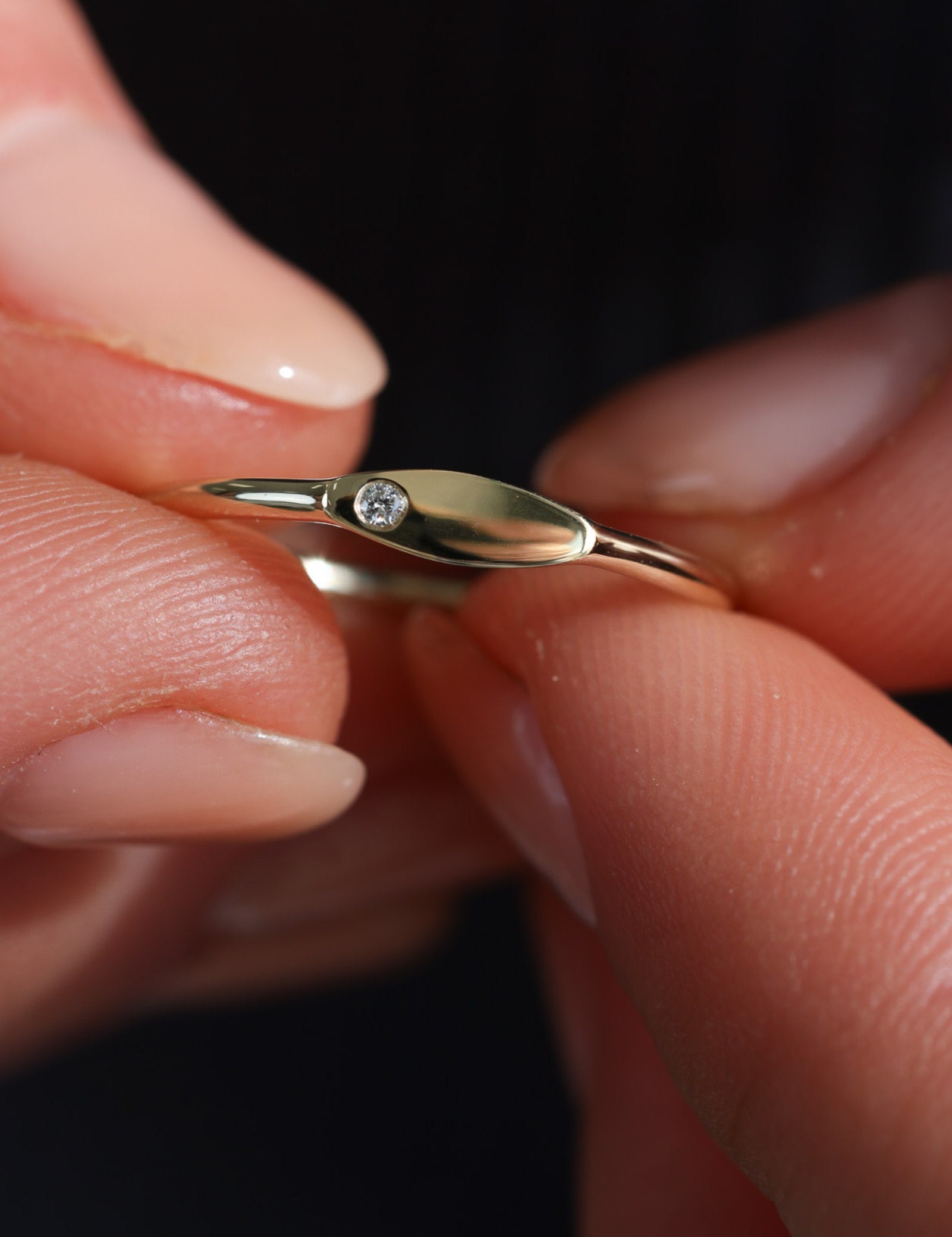 A natural diamond, subtly positioned in the corner, adds a touch of refined sparkle, enhancing its simple beauty. This delicate detail ensures that the Lucille Ring remains a standout piece, perfect for any occasion.