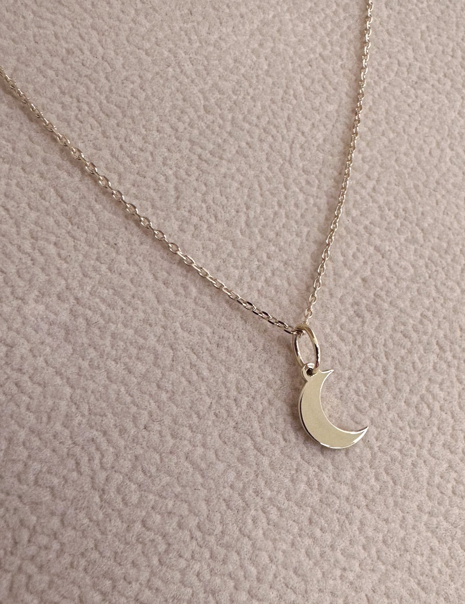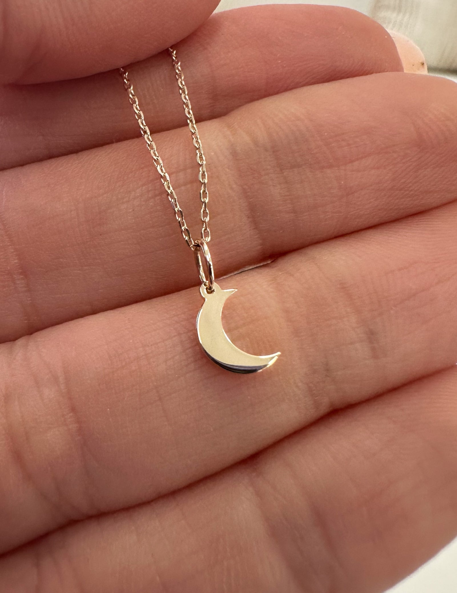 My moon necklace features a crescent moon pendant. The moon is 8.5mm long by 4.5mm wide