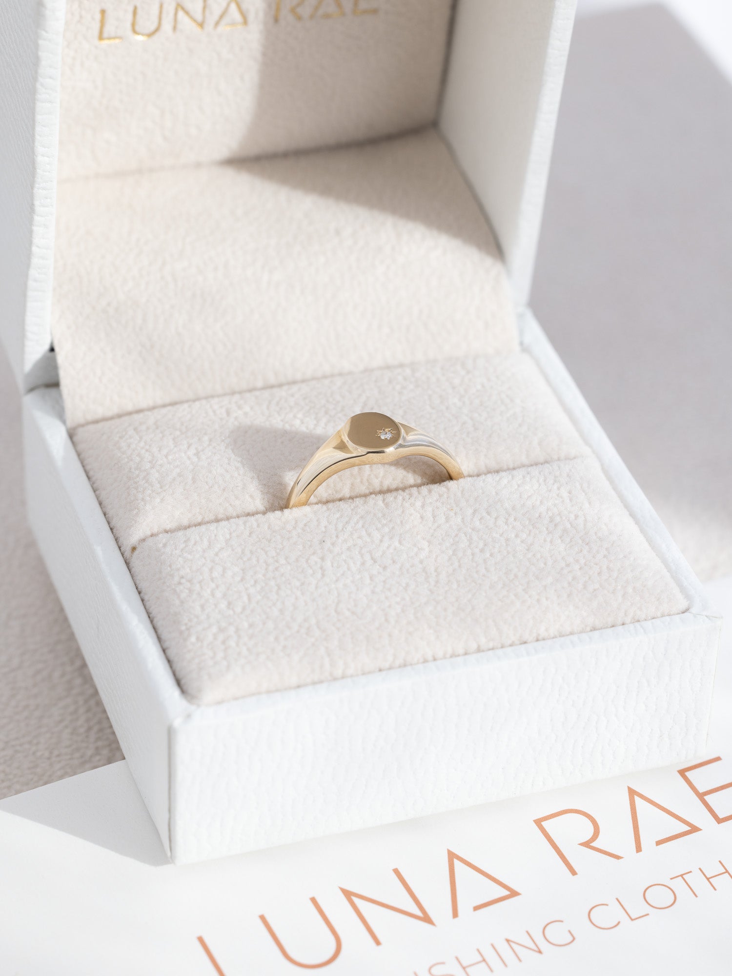 • Premium Packaging: Each Rhia Signet Ring arrives in a signature Luna Rae gift box, accompanied by a complimentary polishing cloth. This premium packaging makes it a perfect choice for gifting or personal keepsakes, while the included cloth helps to keep your gold radiant and lustrous.