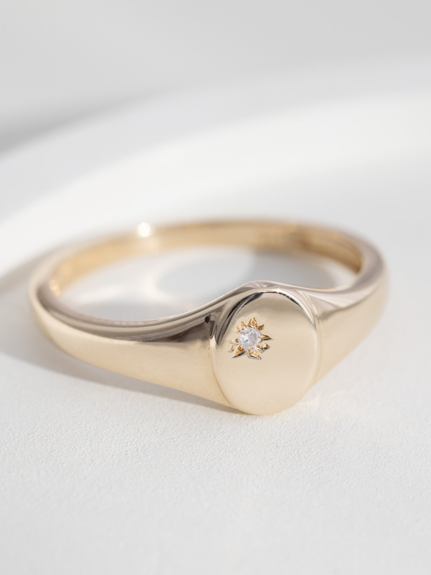 Discover the timeless allure of the Rhia Signet Ring. This 9k solid gold Signet embodies a refined sense of beauty, highlighted by a brilliant-cut white diamond at its heart. It captures the very essence of sophistication and subtle luxury.