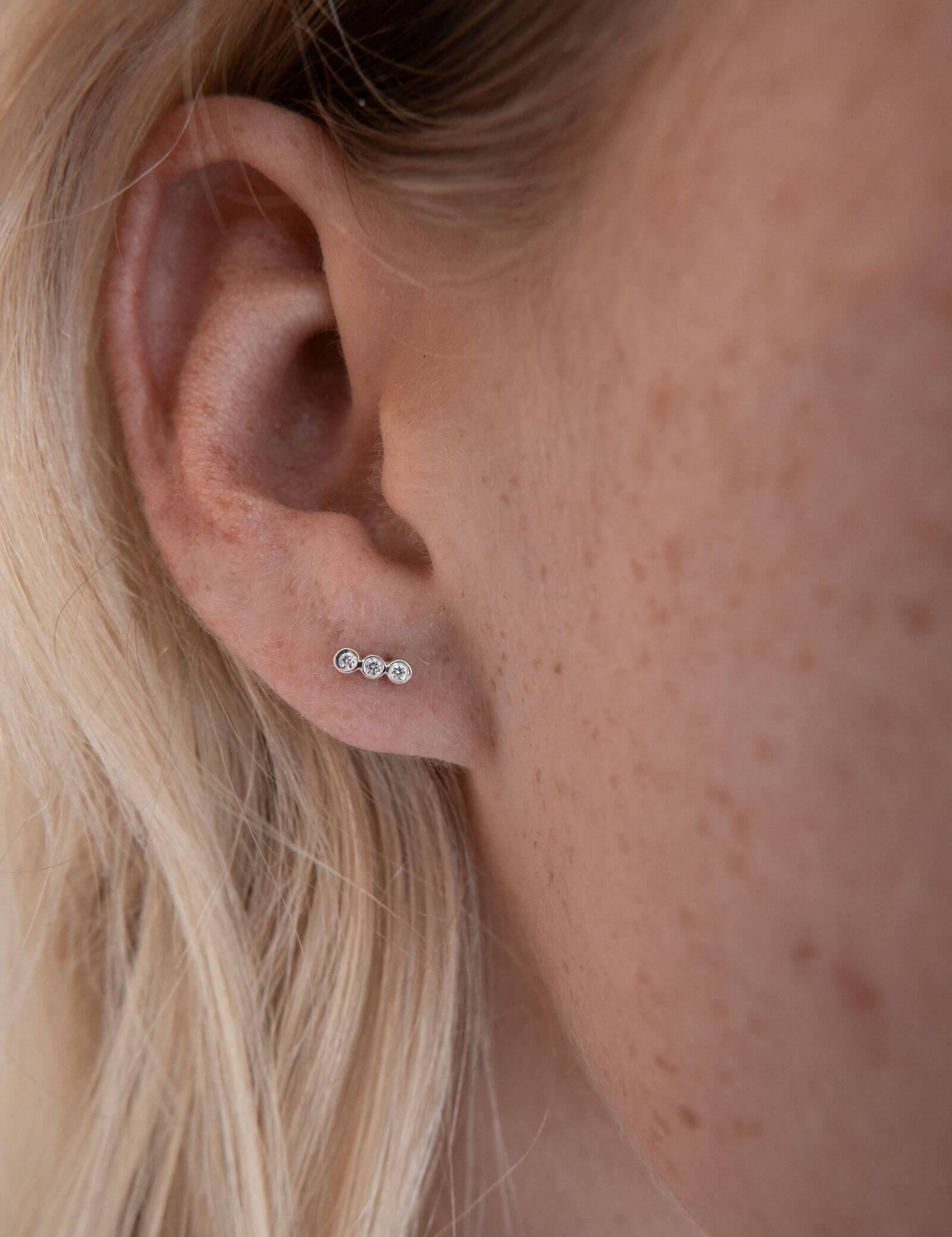 Discover a modern timeless twist with our Vivian Studs. Crafted from Sterling Silver, these exquisite earrings feature three round brilliant-cut natural diamonds delicately lined up in shiny bezels. Whether worn alone for a touch of refined charm or paired with your favourite layering necklaces and earrings, the Vivian Studs are a statement of individual style and grace.