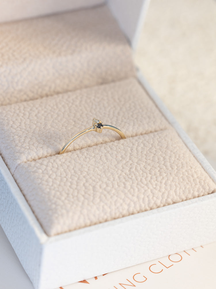 The Solar Ring is a unique design inspired by the harmonious blend of night and day. This exquisite ring features a perfect white diamond and a rare black diamond, beautifully nestled in Solid 9K Gold.