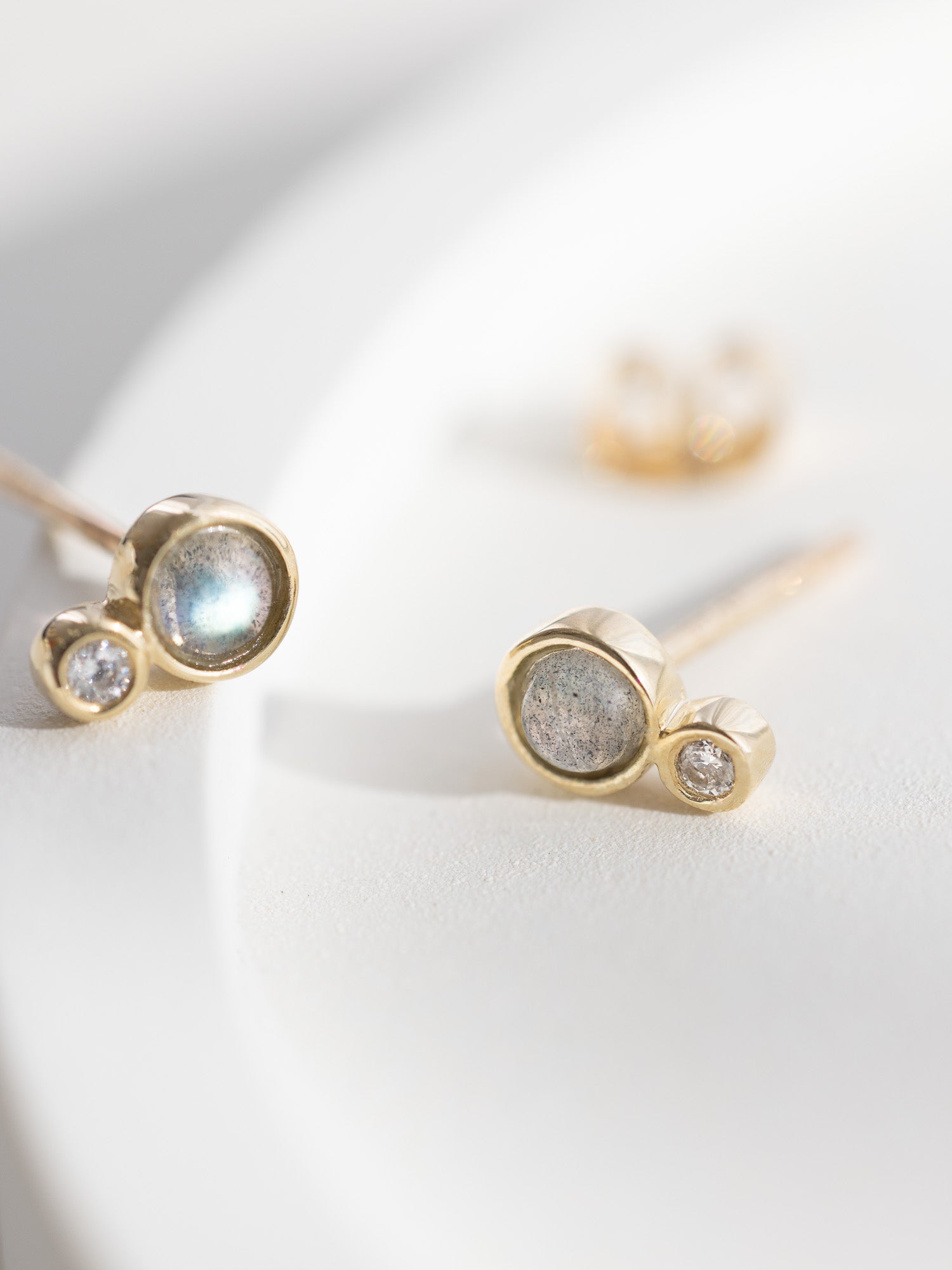 The stud design features a labradorite stone, mimicking the starlit sky, surrounded by solid 9K gold and speckled with a diamond.