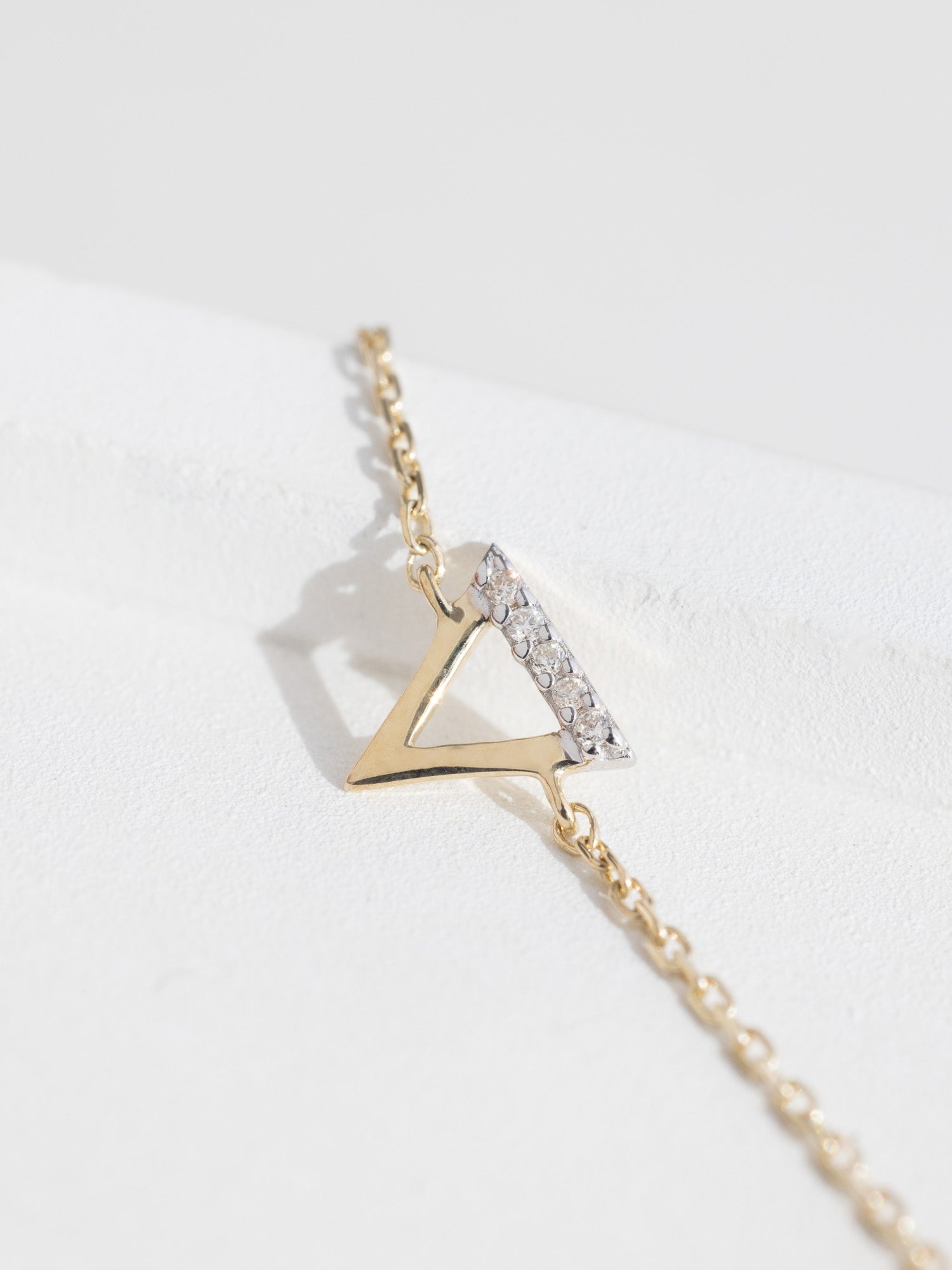 The bracelet has a gold weight of .49 grams, with the triangle measuring 5.6mm on each side, providing a balance of delicacy and substance.