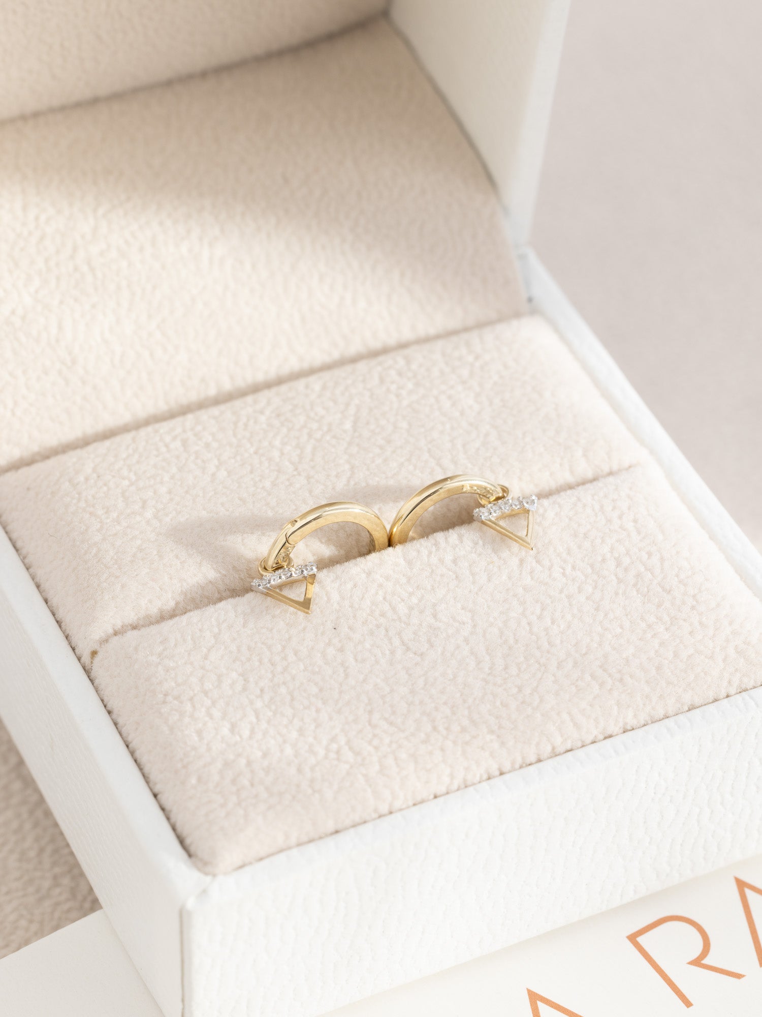 Each Water Element Hoop maintains a balance of delicacy and substance, with a gold weight of 1.08 grams per hoop and the triangle pendant measuring 5mm on each side. Adorned with five 0.8mm brilliant-cut white diamonds, these earrings reflect the essence of water signs with their unique design.