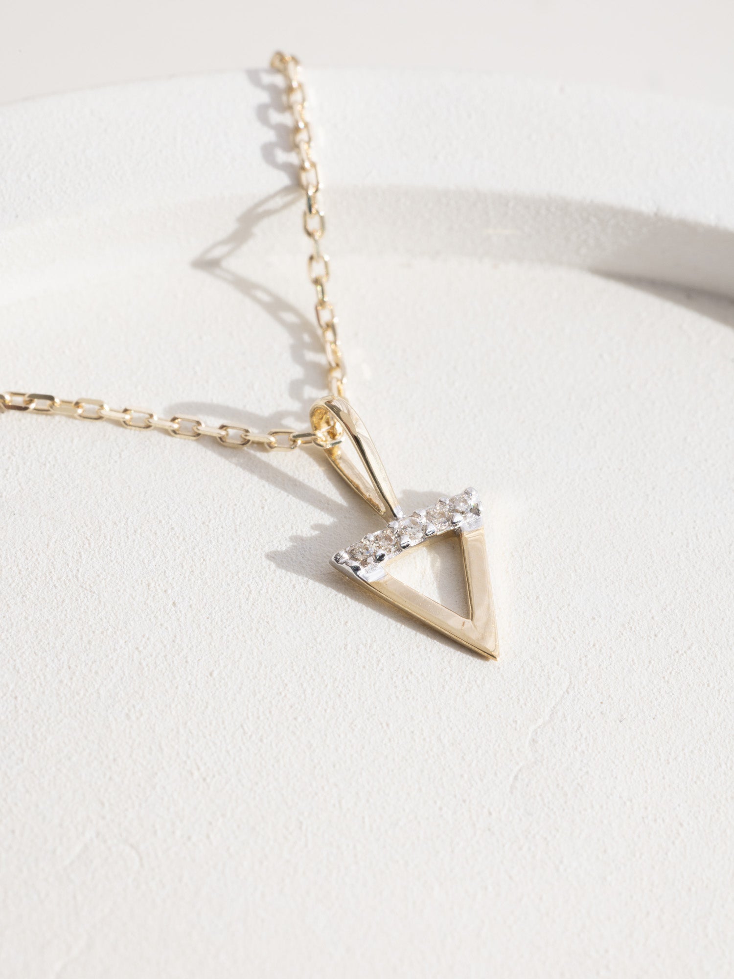 Crafted from solid 9K gold, this necklace features a unique water triangle pendant that points downwards towards the ocean, dotted with a line of brilliant-cut white diamonds that mimic the shimmering surface of water. The Water Element Necklace offers versatile options to suit your style preferences.