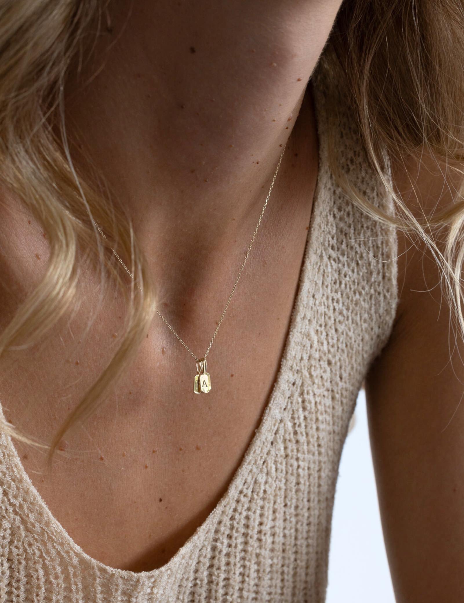 The delicate typewriter-style font allows it to hang as a single charm or be layered with other Luna Letters, creating a personalised piece. Available as a standalone charm or with a solid gold chain of varying lengths, it's a lightweight yet distinctive accessory.