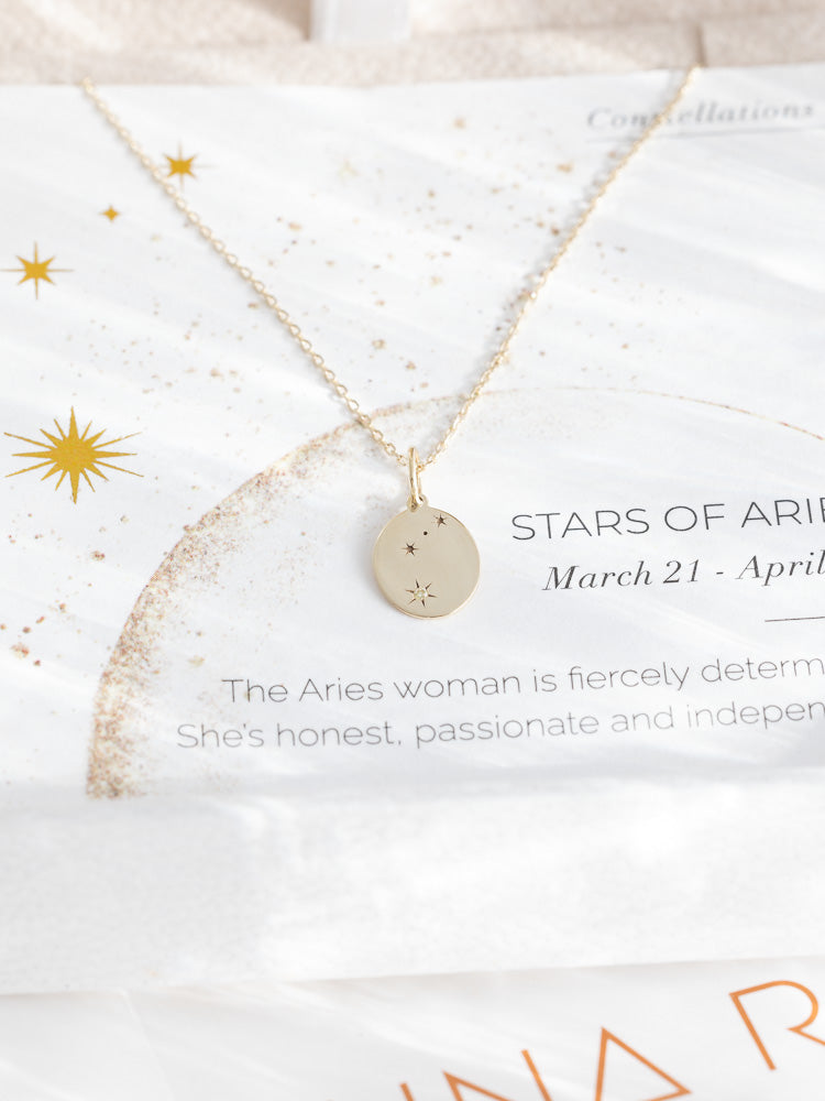 The Stars of Aries charm has a gold weight of approximately 1.20 grams, with dimensions of 8mm x 9.5mm. When paired with a chain, the total gold weight varies based on the chain's length. The necklace features a 1mm white diamond at the formation's tip, with the diamond being a brilliant cut and colour graded as GH-I1. All diamonds used are authentic and ethically sourced