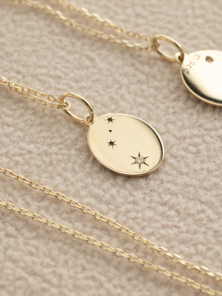 The pendant, crafted from solid 9K gold, captures the constellation pattern with a single white diamond representing the prominent star.