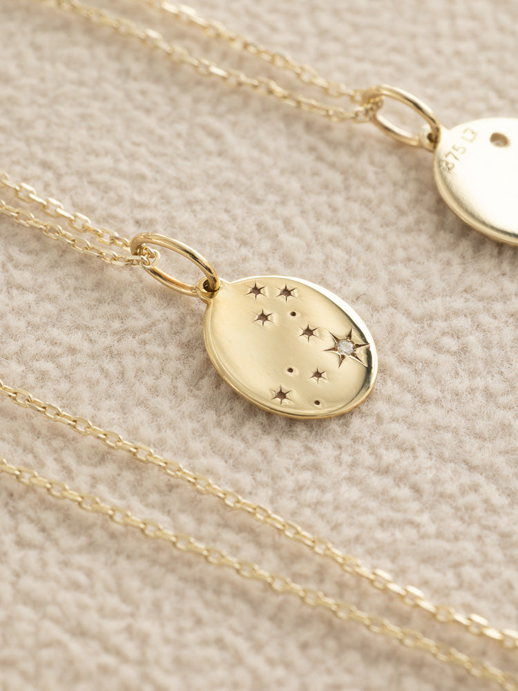 The pendant embodies the constellation pattern, crafted from solid 9K gold with a single white diamond signifying the Omega Piscium star. Choose to purchase it as a charm only or paired with either a 50cm or 45cm solid gold chain.